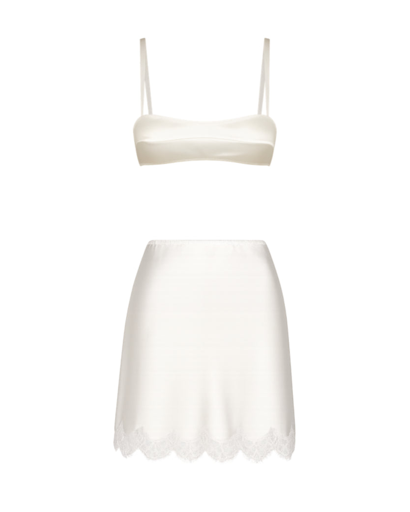 Made from italian silk with delicate chantilly lace accents, this pyjama-inspired set reimagines classic loungewear through a luxurious, evening-ready lens. The soft bra offers an effortless, sculpted fit, while the matching silk skirt falls with graceful fluidity, finished with intricate lace tracing the hem. Equal parts sensual and refined, it transitions seamlessly from intimate moments to sophisticated night-out styling.