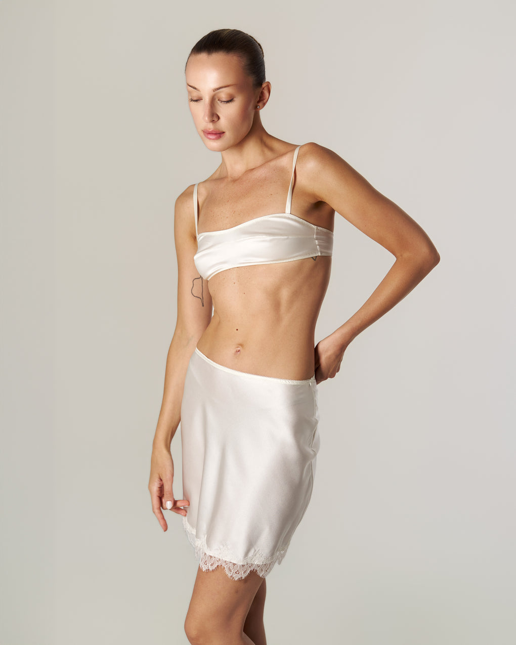 Made from italian silk with delicate chantilly lace accents, this pyjama-inspired set reimagines classic loungewear through a luxurious, evening-ready lens. The soft bra offers an effortless, sculpted fit, while the matching silk skirt falls with graceful fluidity, finished with intricate lace tracing the hem. Equal parts sensual and refined, it transitions seamlessly from intimate moments to sophisticated night-out styling.