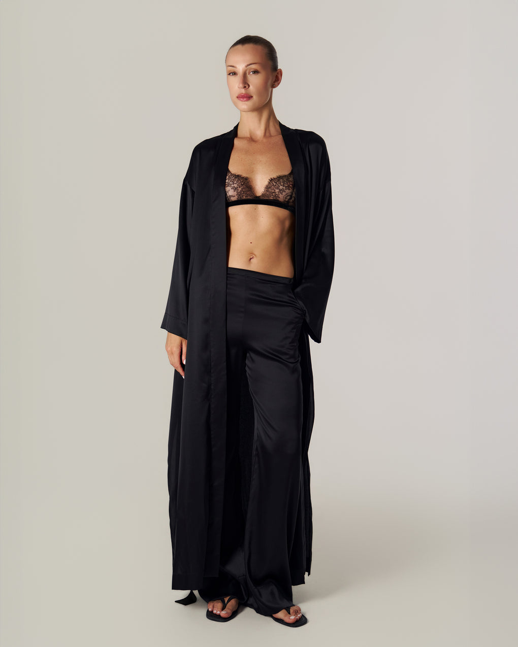 Crafted from pure black silk with a soft, liquid drape, this kimono wraps the body in quiet sophistication. Its relaxed silhouette and flowing sleeves create graceful movement, while the minimalist design allows the richness of the fabric to speak for itself. Equally at home layered over eveningwear or paired with loungewear for elevated ease.